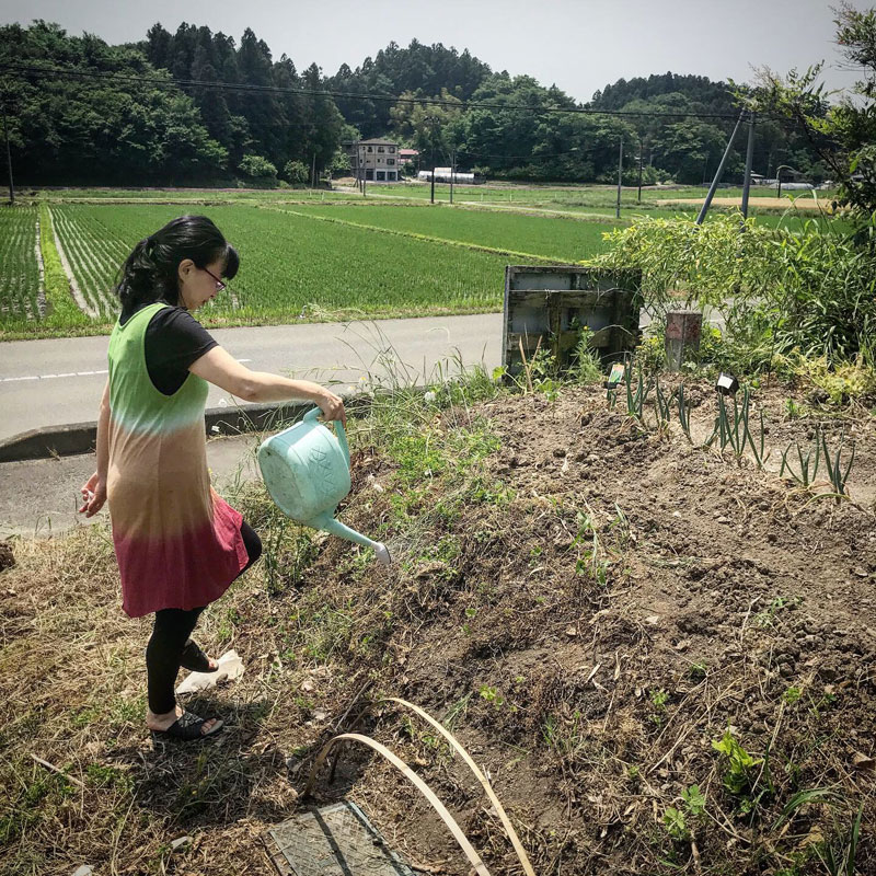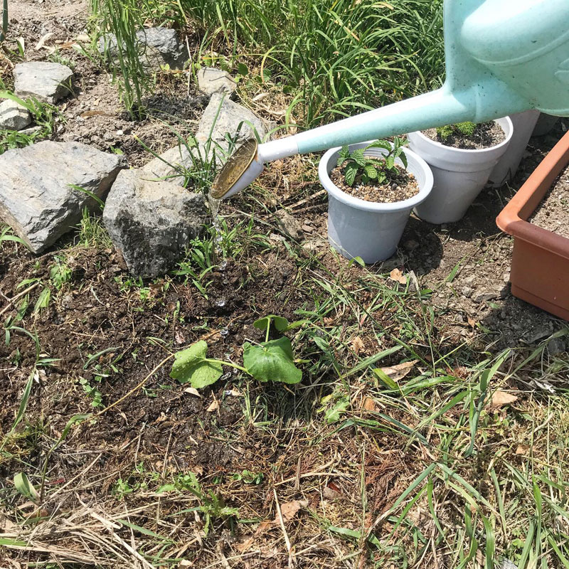 あやこさんにもらった花に水をやってる。