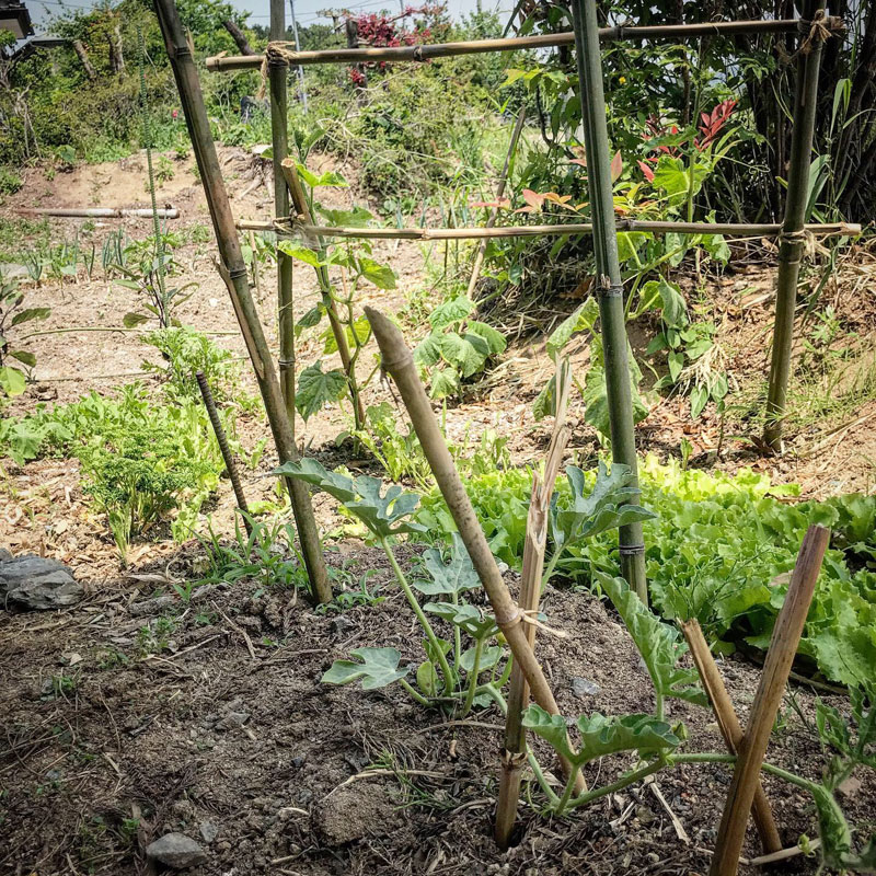 きゅうりの誘引もうまくいってる。3本のうち2本の専用棚。1本は南天の木にまとわりつかせてしまおう・笑