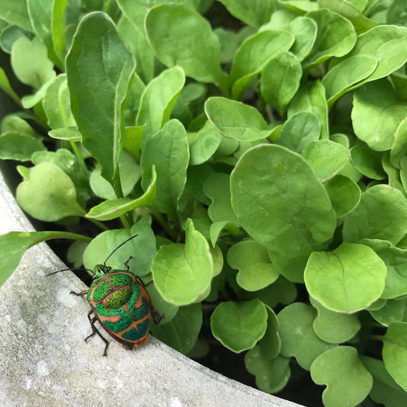 ルッコラに緑に輝くカメムシ。黄金色に輝いて色は綺麗なんだけど。
