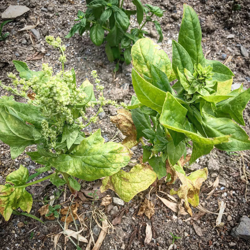 ほうれん草には雄花と雌花があるんだって。立ち姿の違う二本を残しておいて正解。