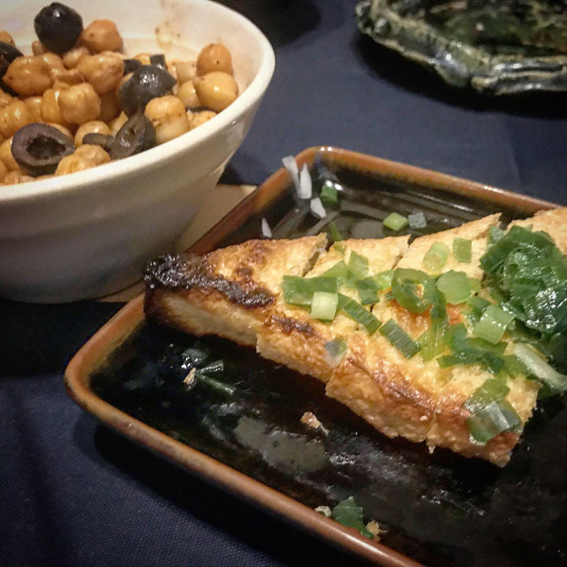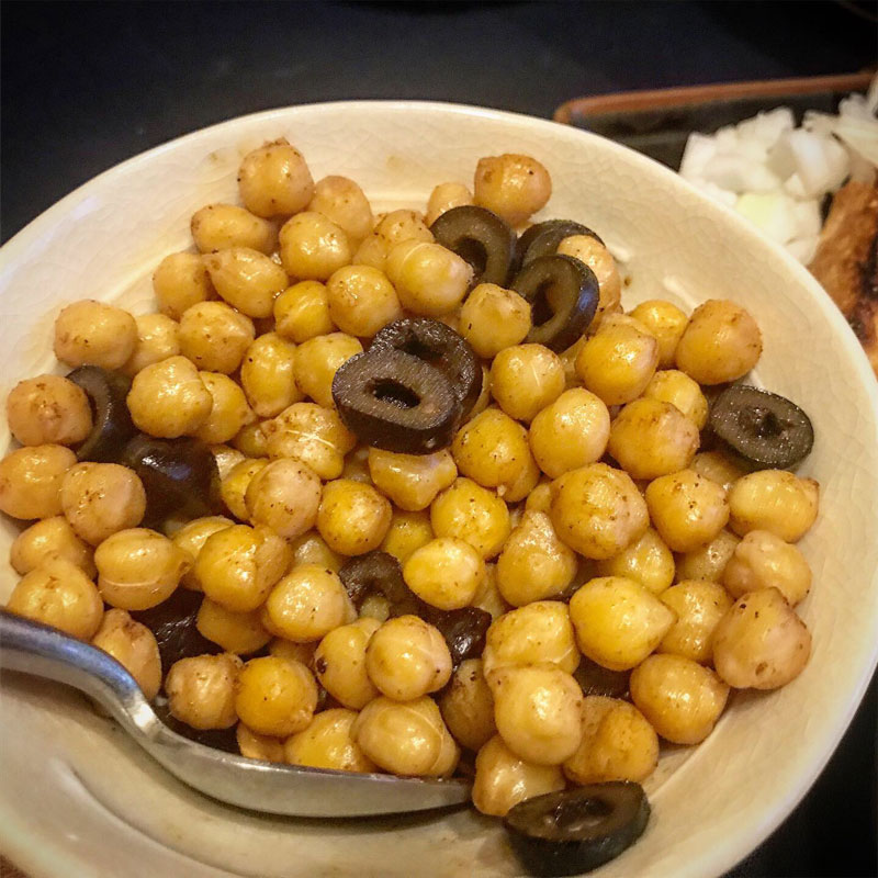 ひよこ豆と黒オリーブのスペイン風炒め。庭の猫の額畑の間引きサラダ。
