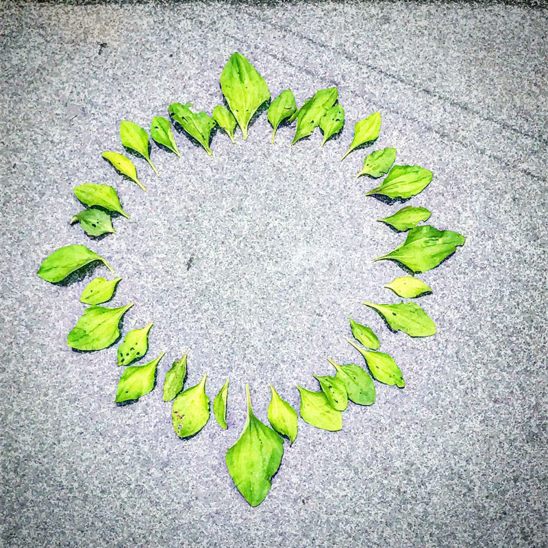仕事場の石テーブルの上に葉っぱを並べてみた。