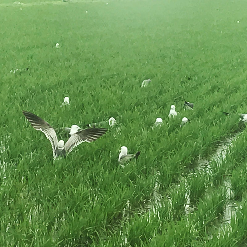 田んぼにウミネコがたくさん。稲が伸びたから遠くからだともういるかいないかわからない。