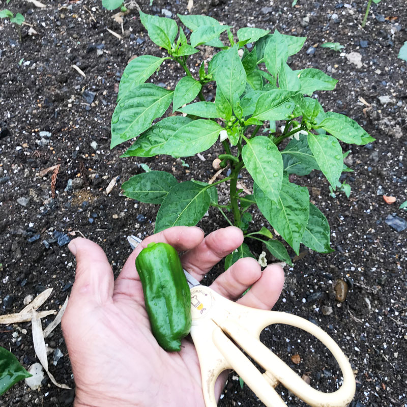 ピーマンのひとつめの実。栄養はまだまだ実ではなくて本体に行って欲しいので今晩食べてしまう。