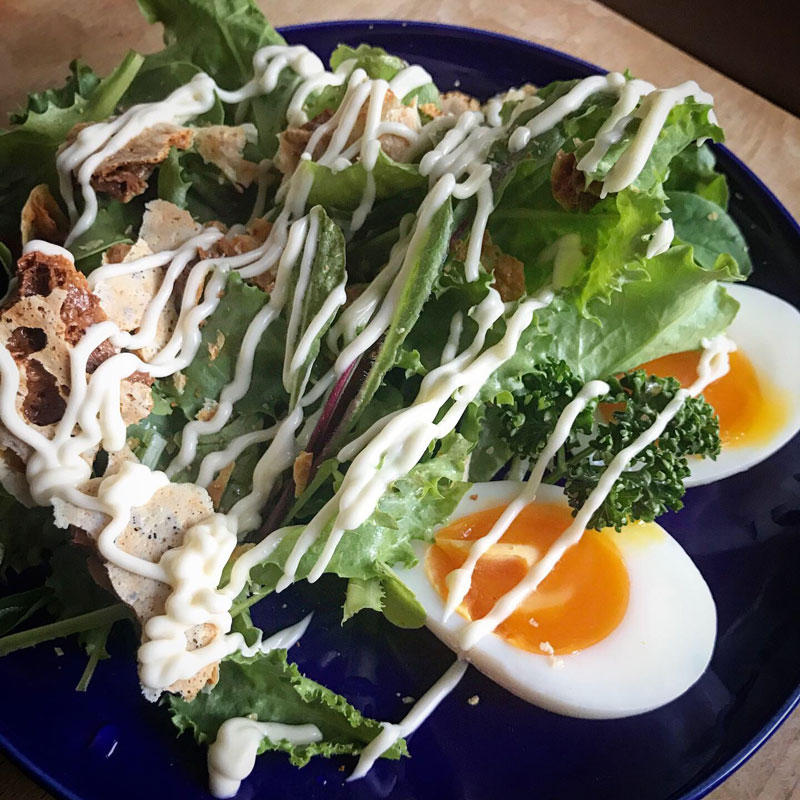 畑の間引きサラダに今日は半熟ゆで卵とチーズをカリカリのせんべい状にして割り入れてチーズトッピングのサラダに。