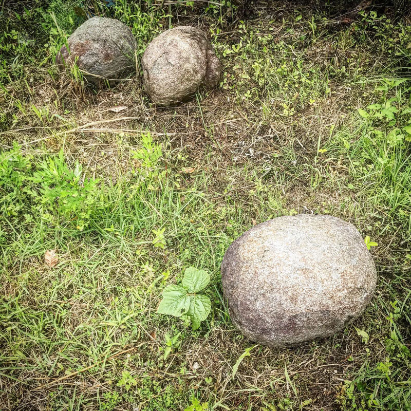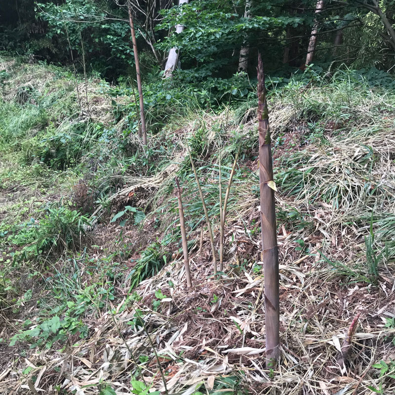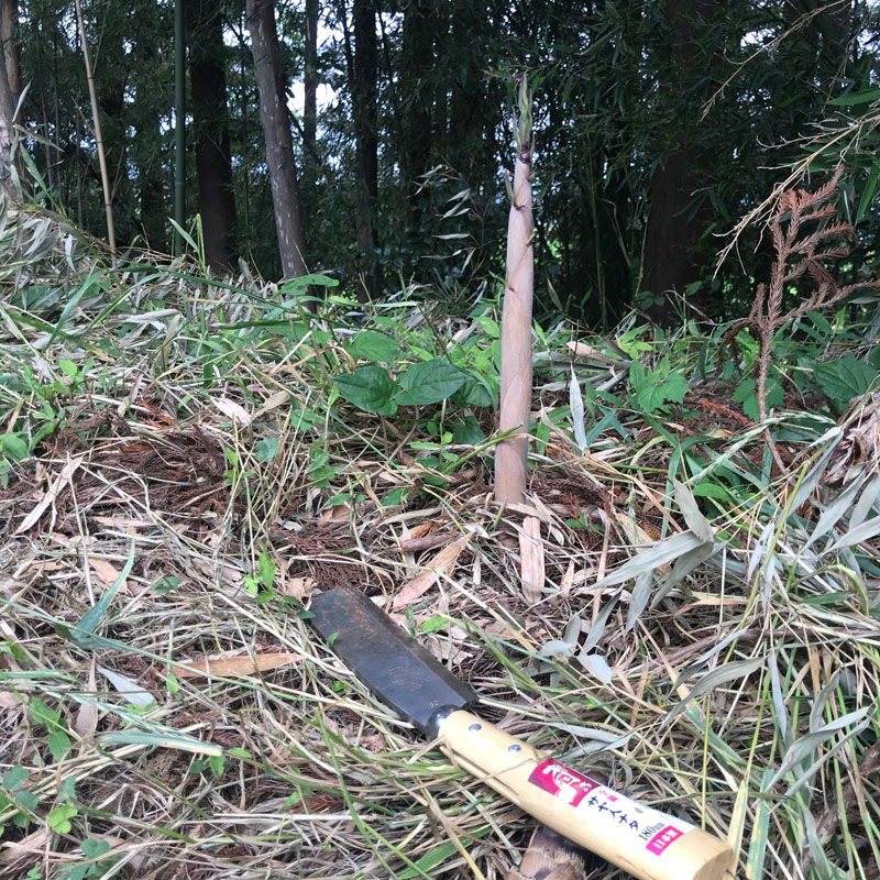 雨上がる。雨後の筍のことわざ通り家の周りがタケノコだらけ。あっという間に僕の身長を超えてるものも。午後の石彫りに行く前に鉈で全部倒していく。