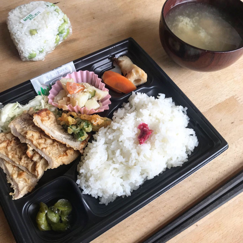 今日の昼食はあぐりっとの弁当とずんだ豆のおにぎり。