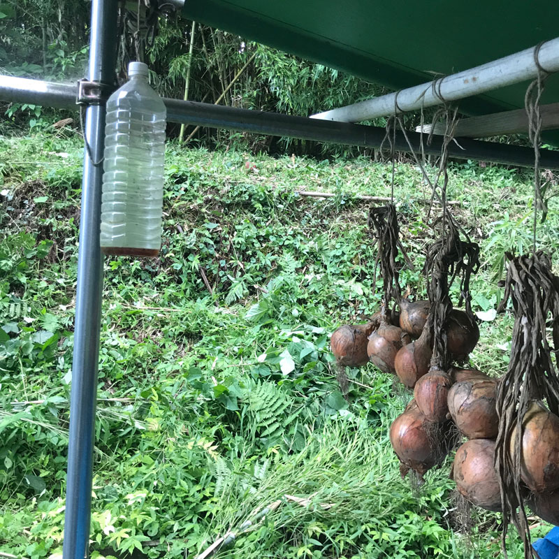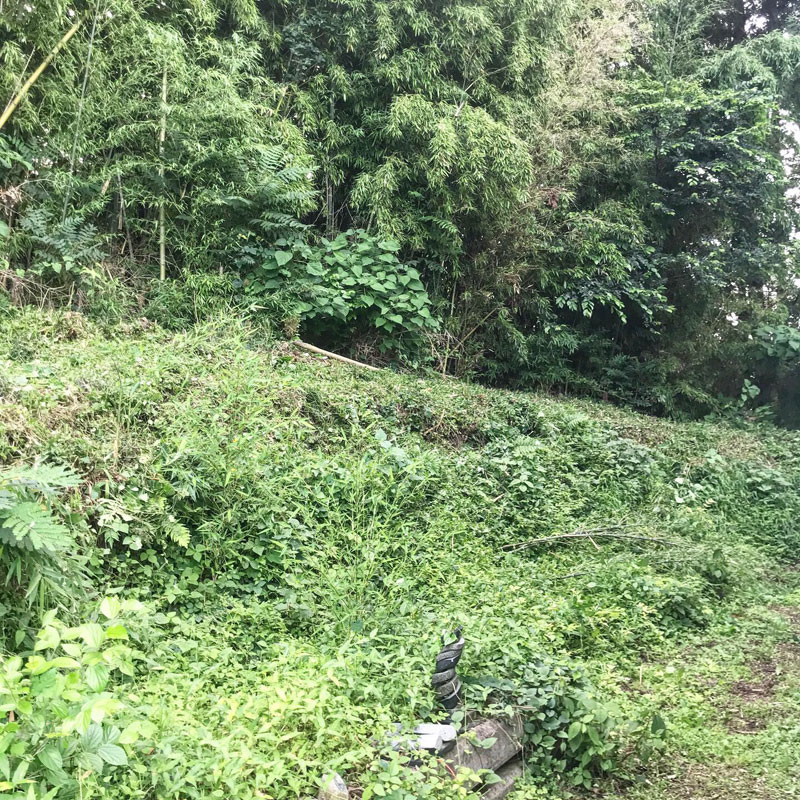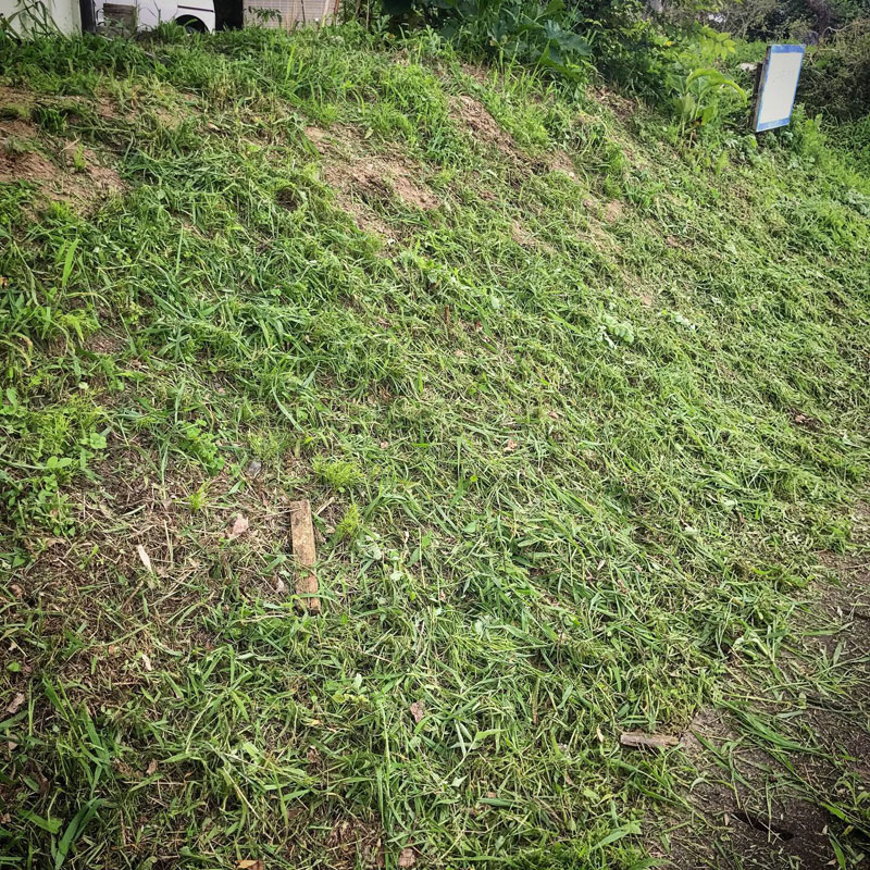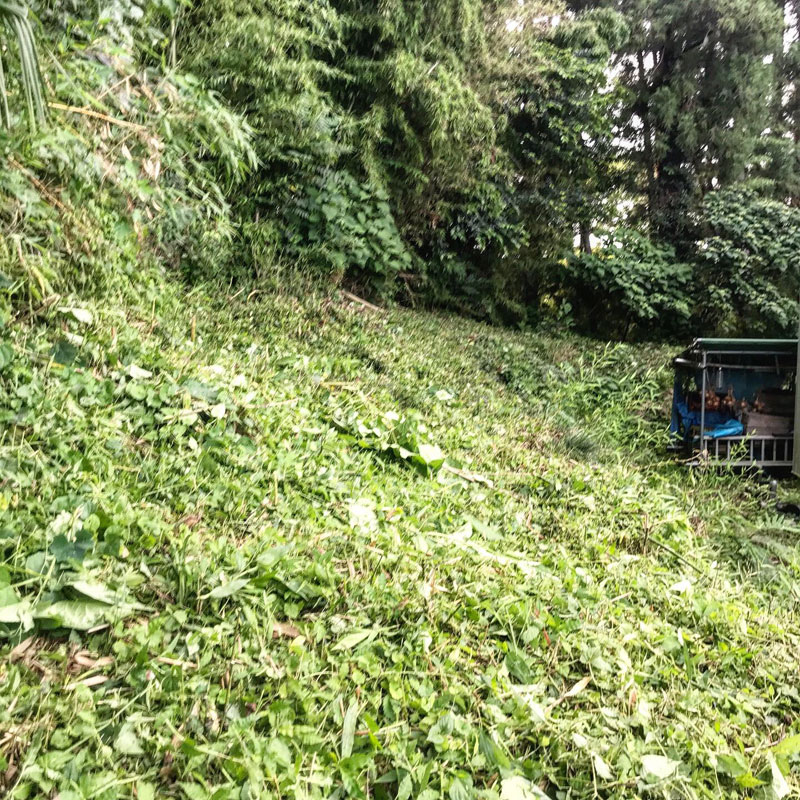 辺りに飛び散った草を竹ぼうきで掃いて終了。滝の様な汗。