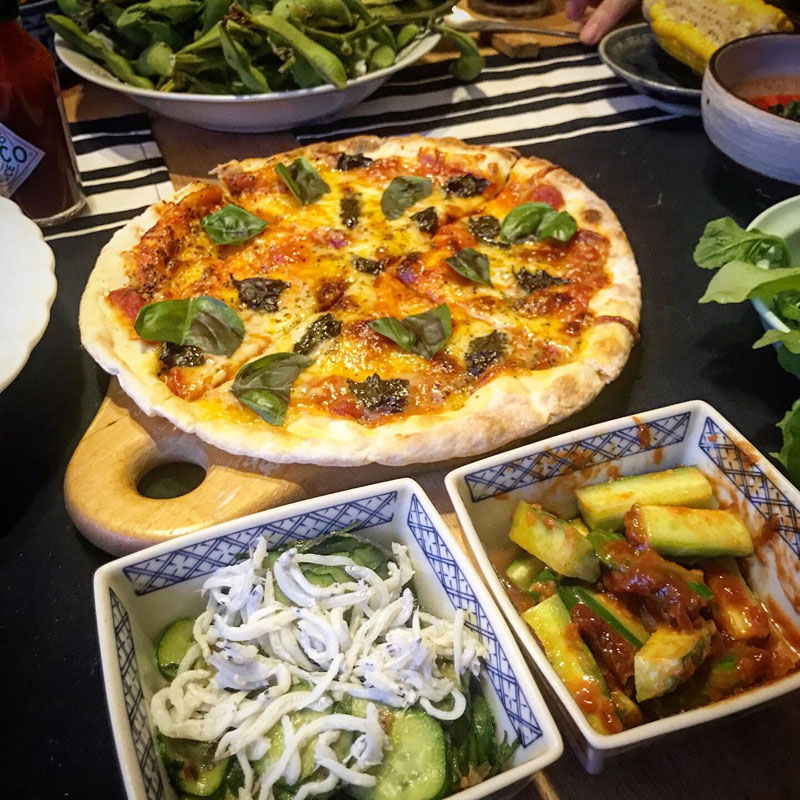 庭のパセリとサワークリームをトッピング。買ってきたピザに畑のバジル乗せて焼いた後にもバジルとルッコラたくさん乗せて。