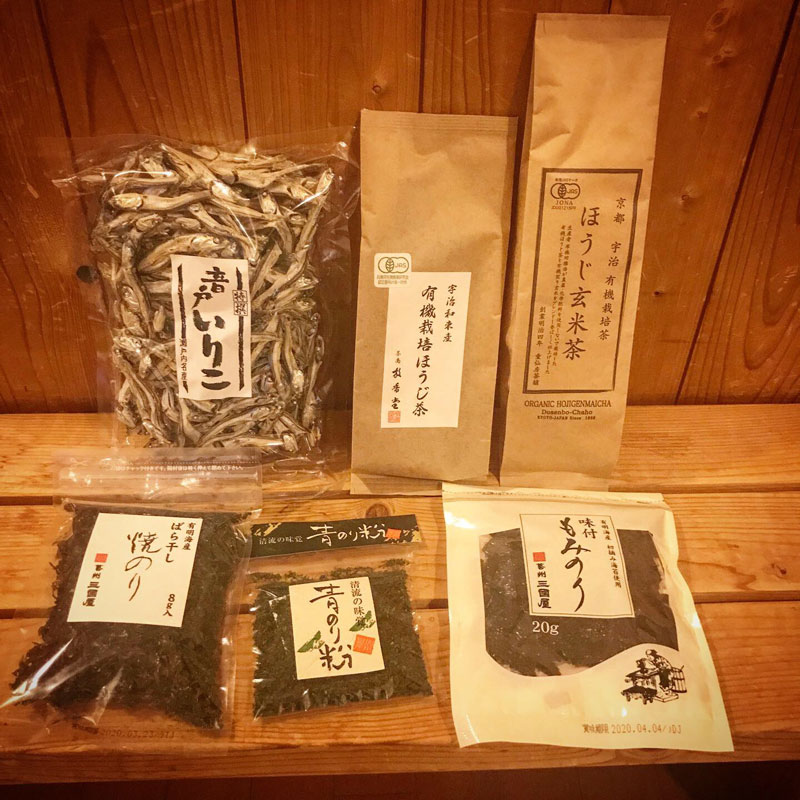 出汁パックやいろんな出汁、出汁を取るためのいりこや厚く削った鰹節、