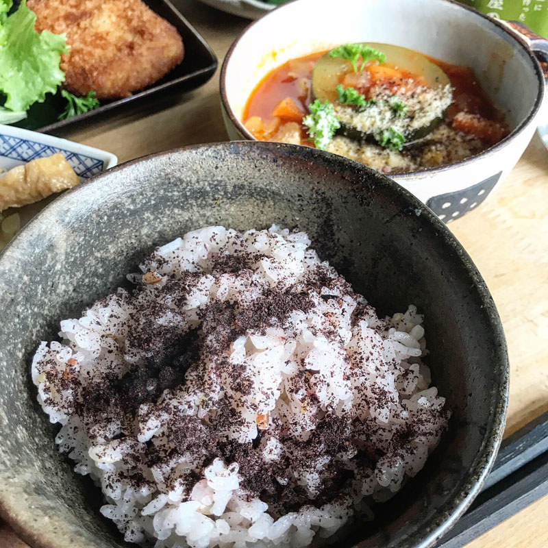 色米を混ぜて炊いたご飯にゆかりふりかけて。