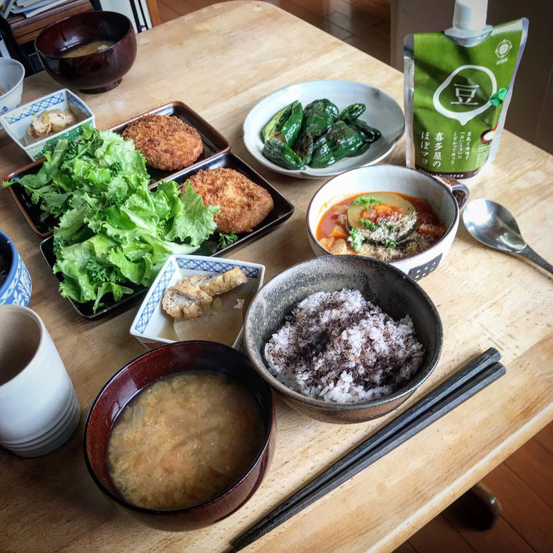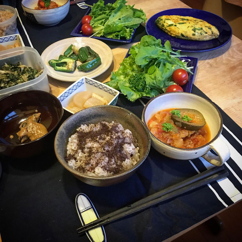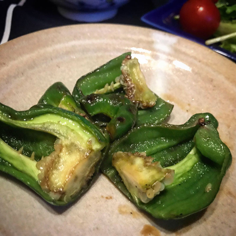 昼食に畑のサラダにかけて早速、食べてみる。柚子胡椒も入ってて美味しい!朝、近所の方にピーマンとナスをたくさんいただいたのでピーマンは蒸し焼きに、