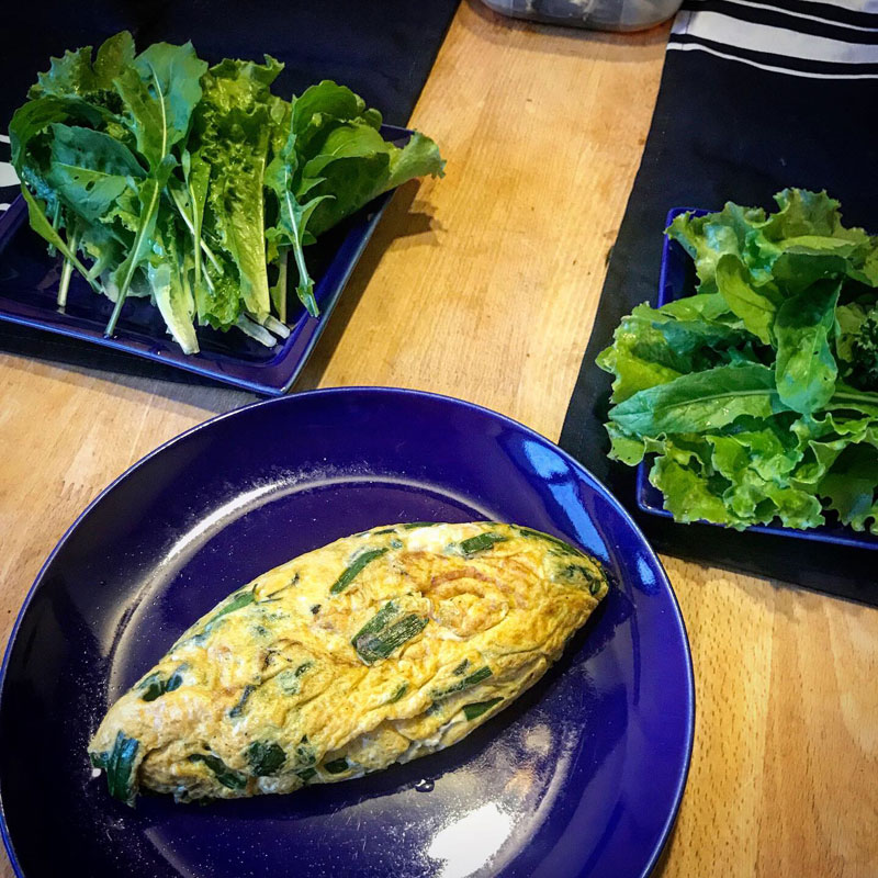 ニラたっぷり入れてオムレツに。ニラ玉ですね。