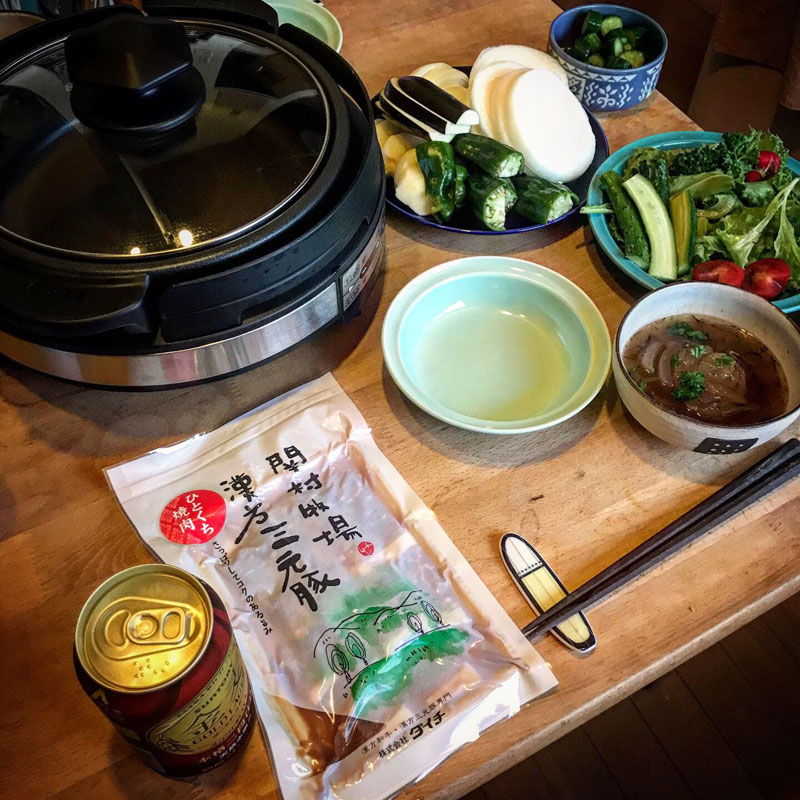 居酒屋我家、開店。東北電力のポイントでもらった漢方三元豚と野菜を焼く。