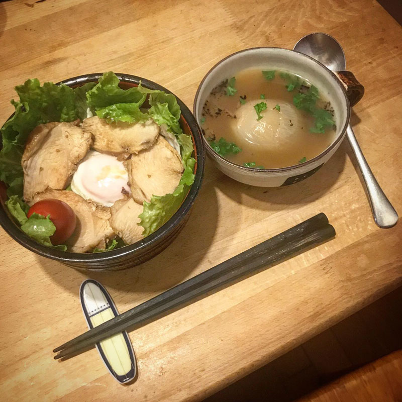 茶色い夕食だなぁw 鶏肉の土鍋煮と目玉焼きで変形親子丼。