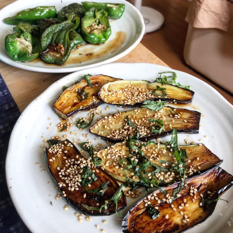 ナスはたっぷりの油で焼いた方が実がとろとろになって美味しいけど、ナスは一度吸った油を最後吐き出すのでフライパンに油が残る。もったいないのでその油でピーマン焼きも。