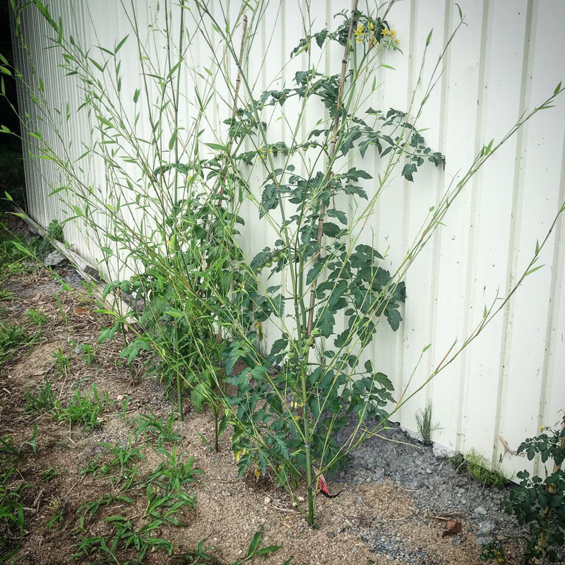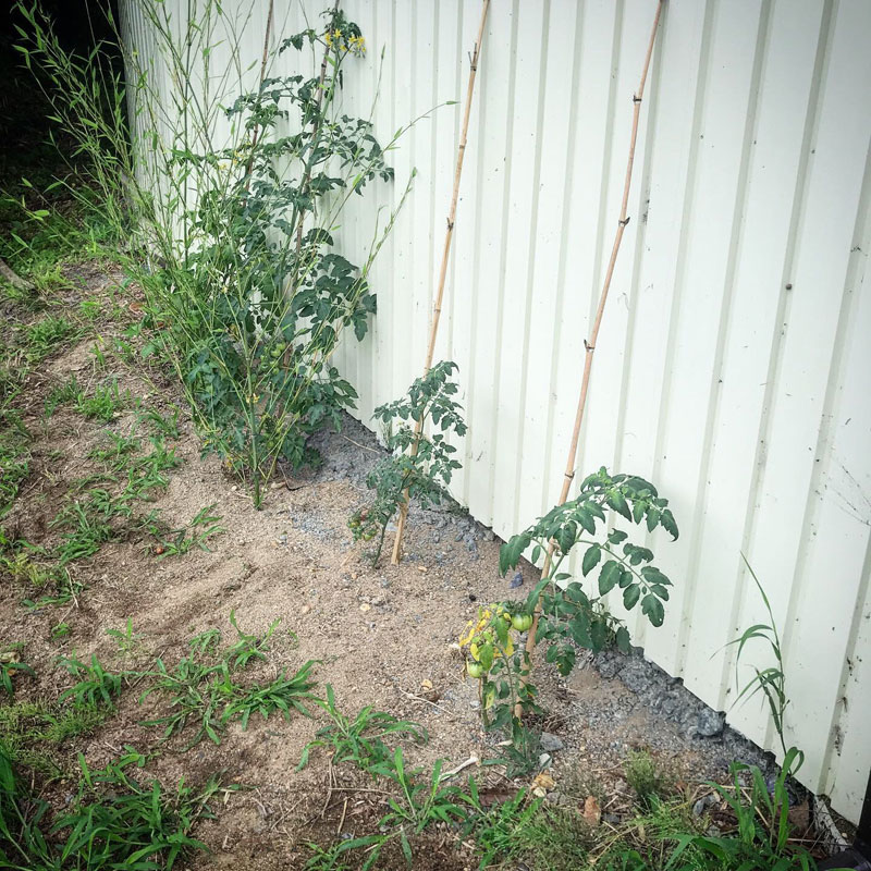 ミニトマトが赤くなって明日食べられるかな?と思うととられている。多分カラス。枝のたくさん出た竹を前にさしてみる。