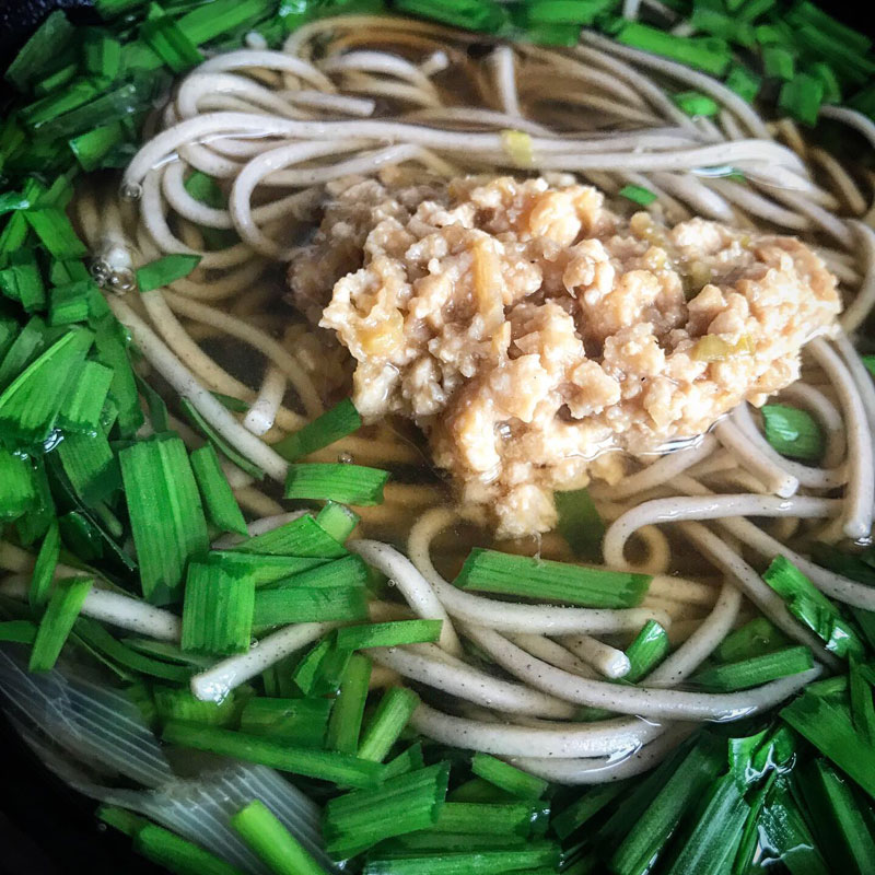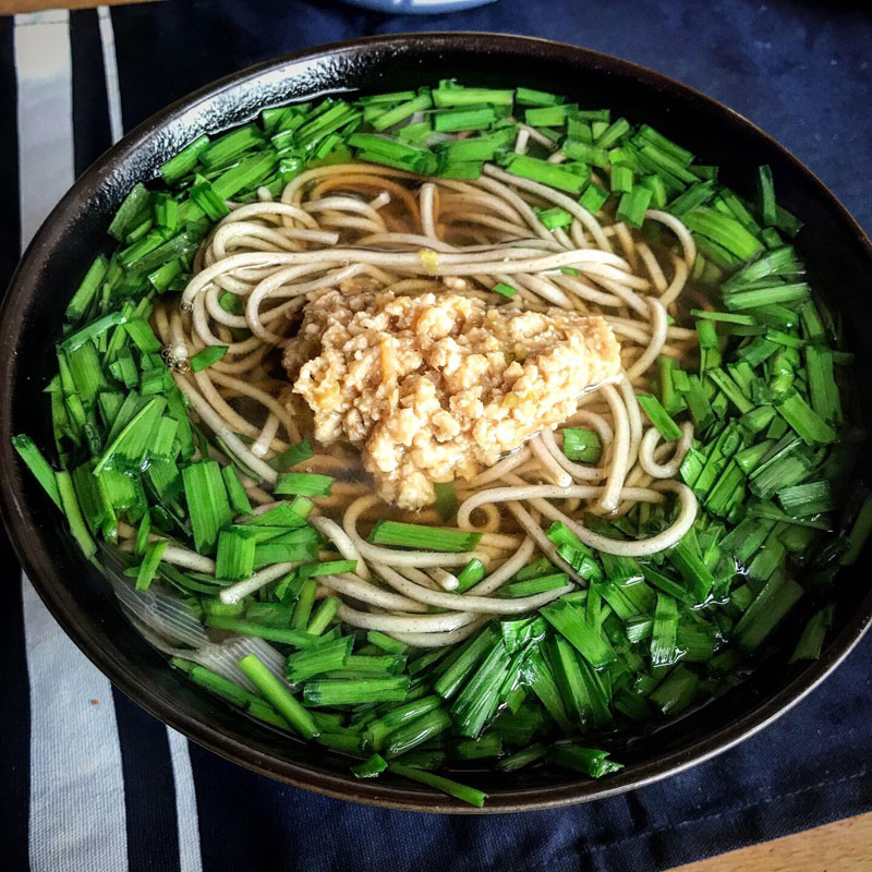 カミさんの作った肉味噌乗せて出来上がり。ニラ甘い。美味い。