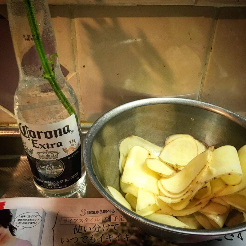 大3つをまたポテトチップスに。初めて作ったのは30年前。スライスした後、新聞紙に並べて干したり水にさらしたりいろいろなパターンやってきたけど、たどり着いたやり方はかなりシンプル。