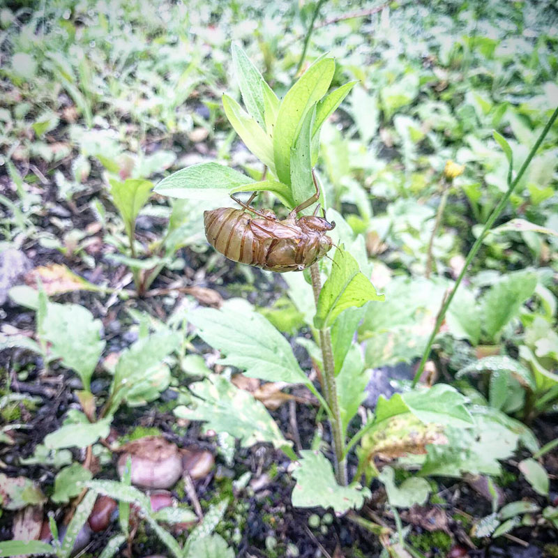 今年、庭で羽化する蝉たちのとまる木の高さが低いこと。今朝は畑の枝豆の葉と