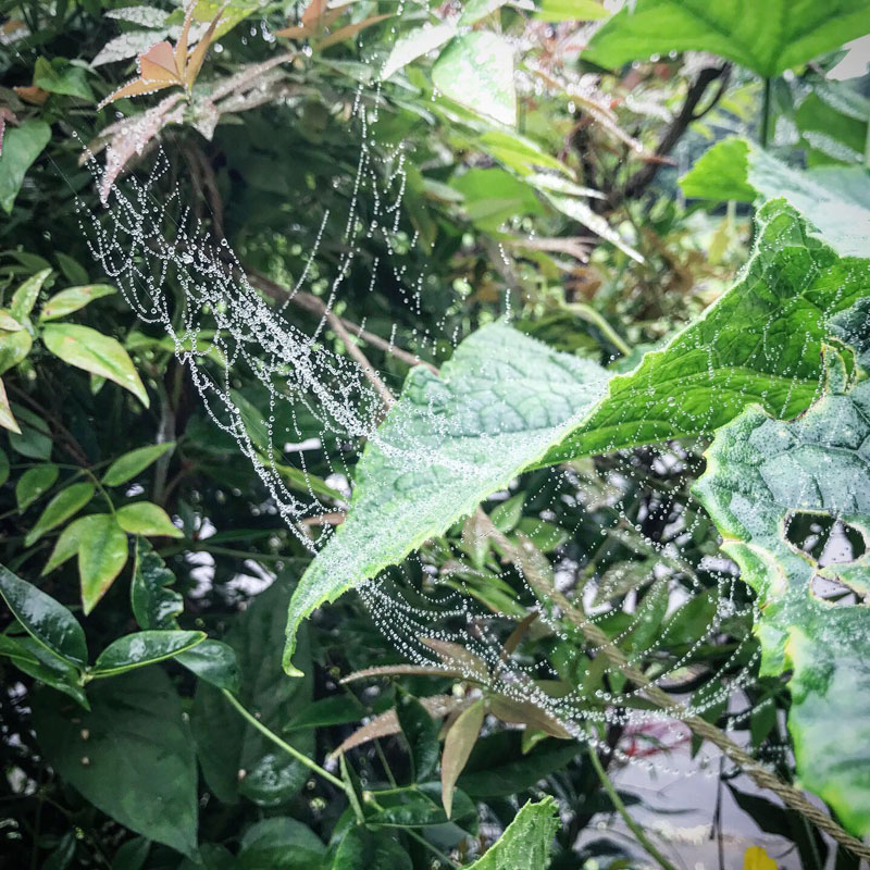 今日も雨。もう助けてって感じ。きゅうりに張られた蜘蛛の巣の雨粒、