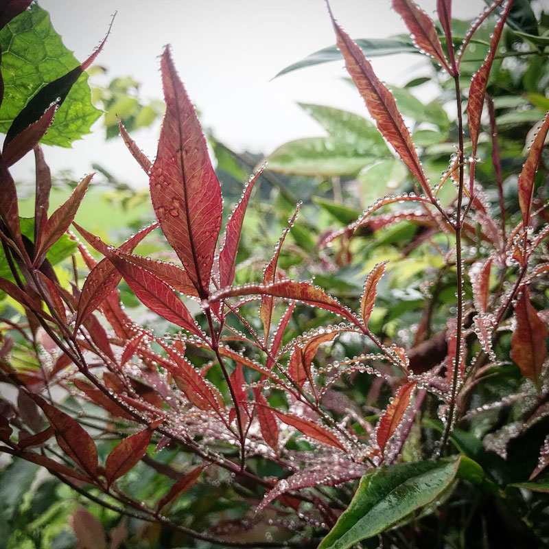 水滴をまとった南天の葉、