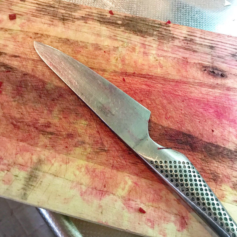まな板も真っ赤に染まる。