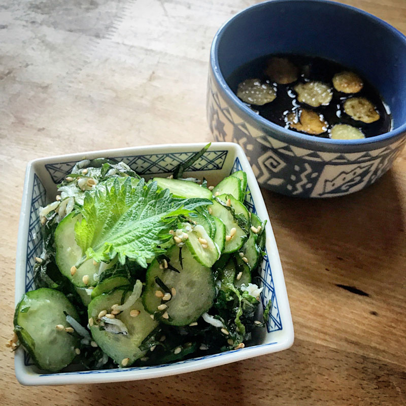 教え子に教えてもらった我が家の定番になりそうな、きゅうりの一品。紫蘇、シラス、塩、ごま油で和える。今日は更に白ごまも。
