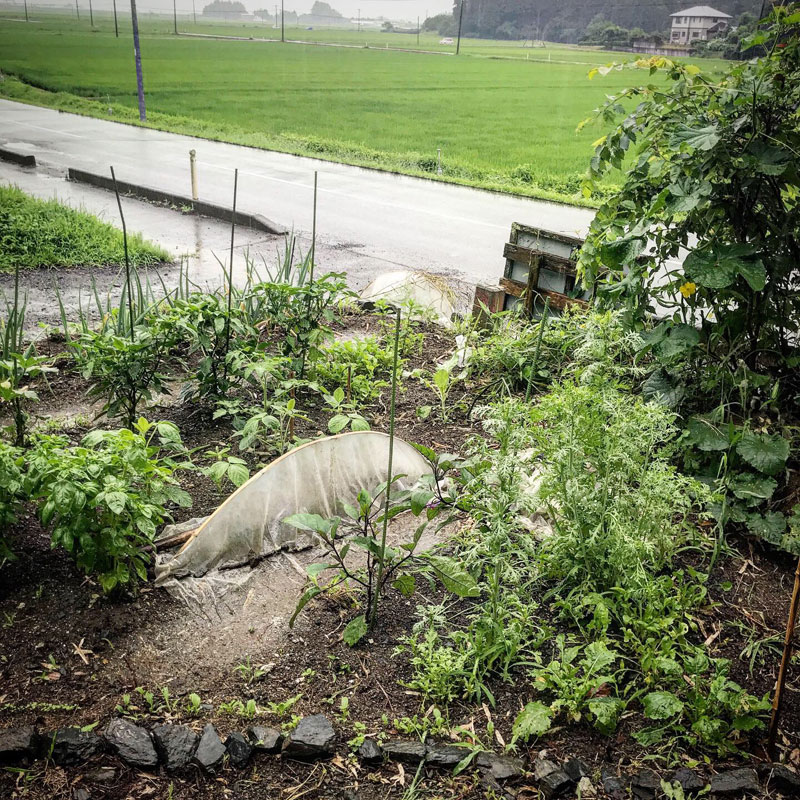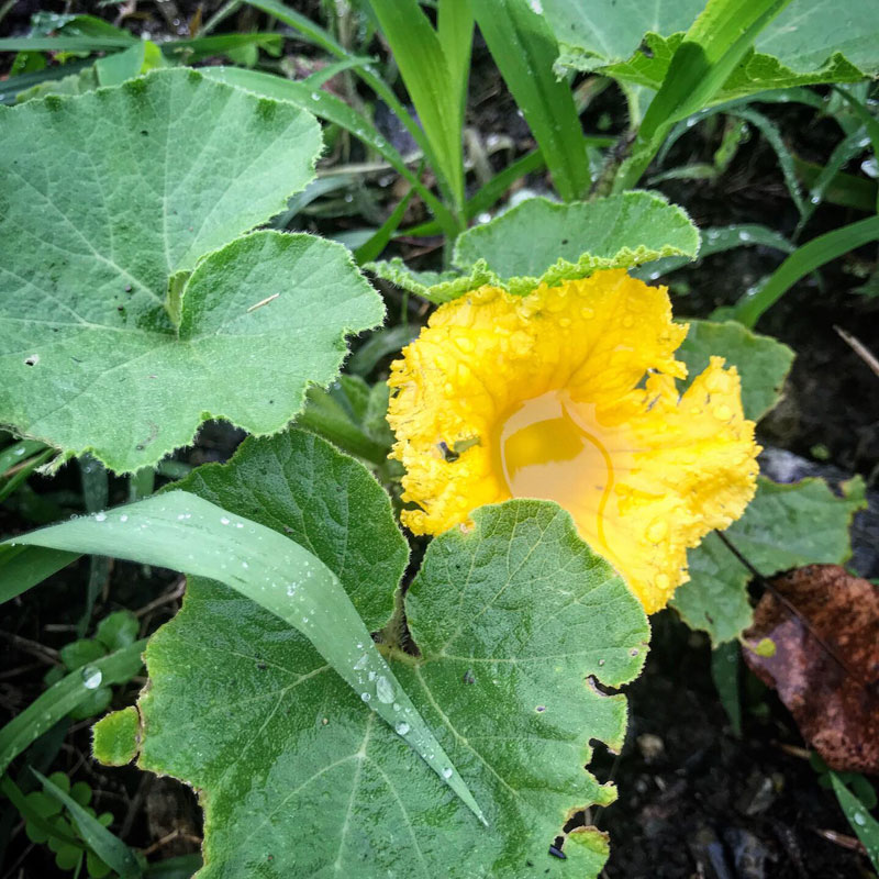 こぼれ種から芽が出たかぼちゃの花にたまる雨。