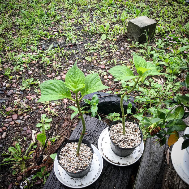 土手に直接挿した紫陽花は枯れそう。軽石に挿したこの二本はまだ元気。初めての紫陽花の挿し木、うまくいきますように。