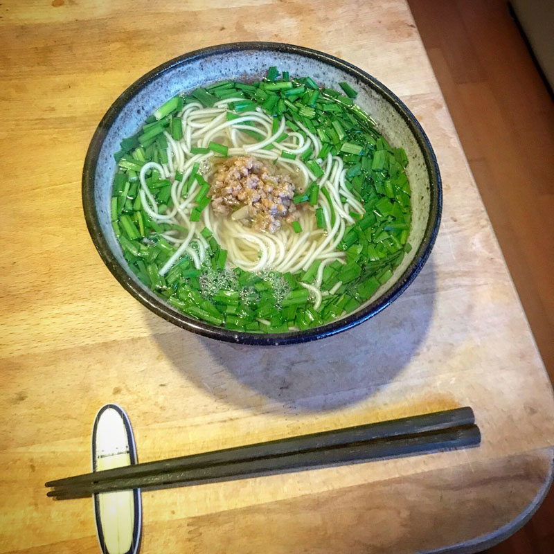 ニラたっぷりの温麺、肉味噌のせ。夕食に作った。
