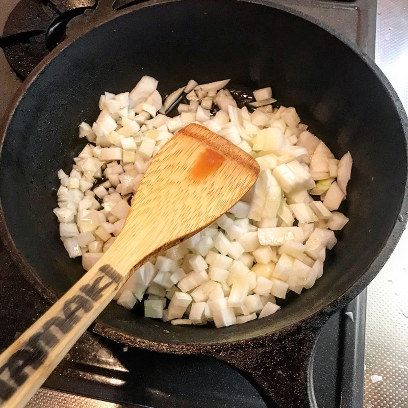 始めのオリーブオイルでにんにくと玉ねぎの蒸らし炒めが大事。