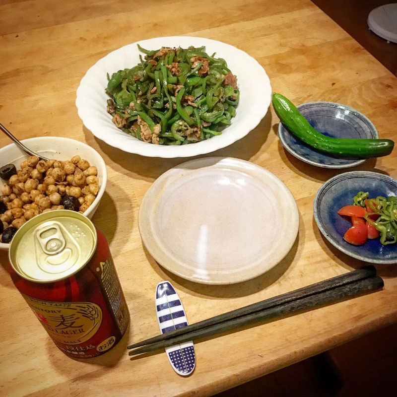 居酒屋我家、開店。青椒肉絲。祭りのきゅうりの一本漬け、ミニトマトとピーマンのマリネ、ひよこ豆と黒オリーブのスペイン風炒め、金麦。