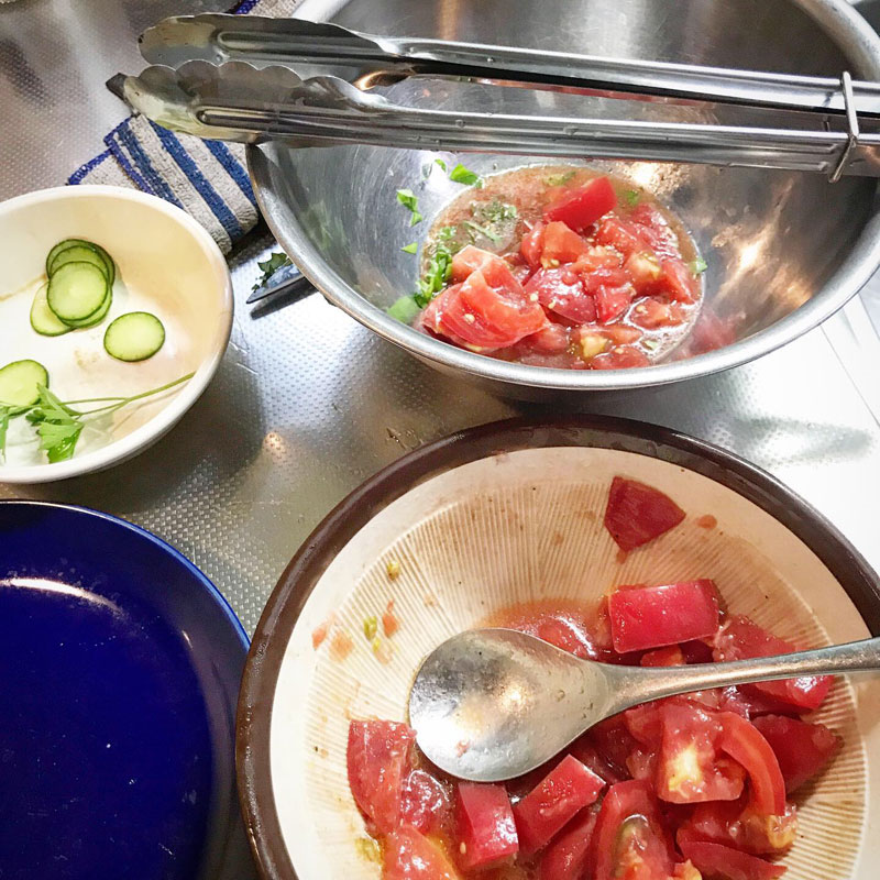 冷蔵庫で冷やしておいたトマトソースに畑のバジルをちぎり入れて和えた。