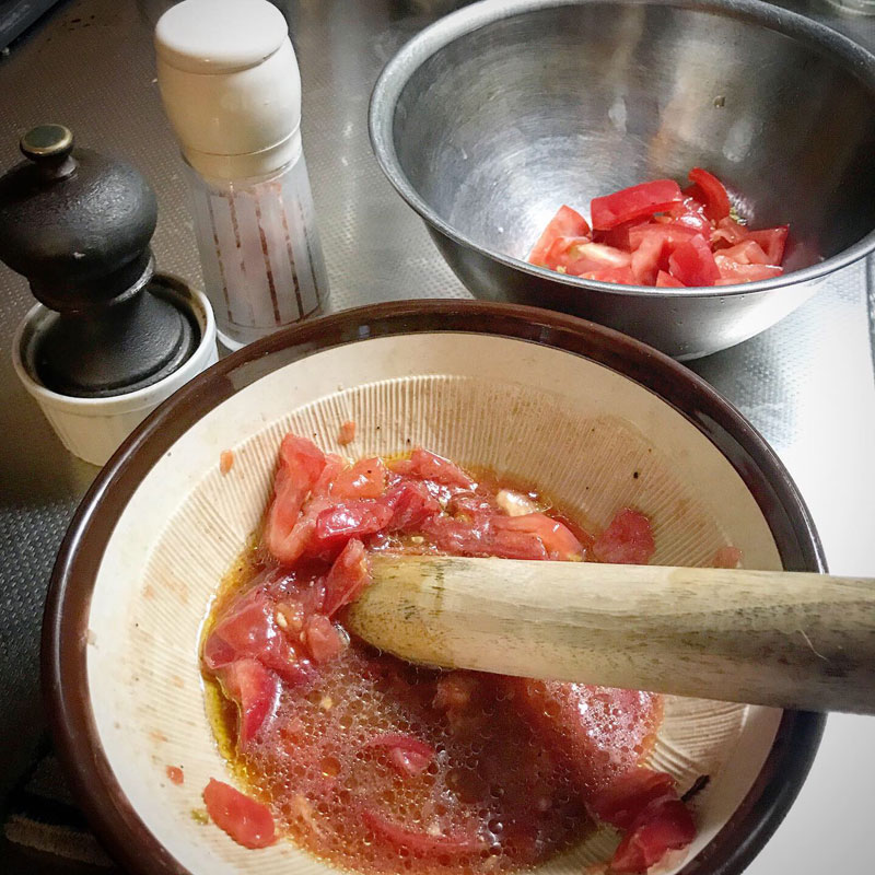 朝、すり鉢でニンニクひとかけをとろりとすって、ザク切りのトマトとオリーブオイルと塩で和えて冷やしておく。