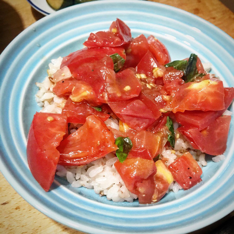 昼のトマトの冷製パスタのソースも少し残ってたのでこれも丼に。
