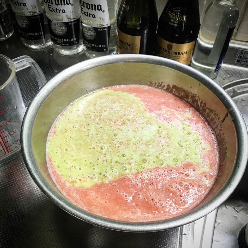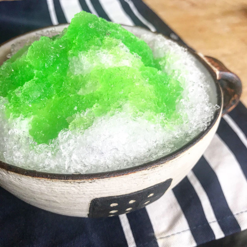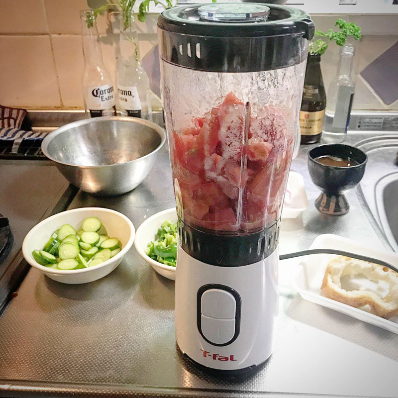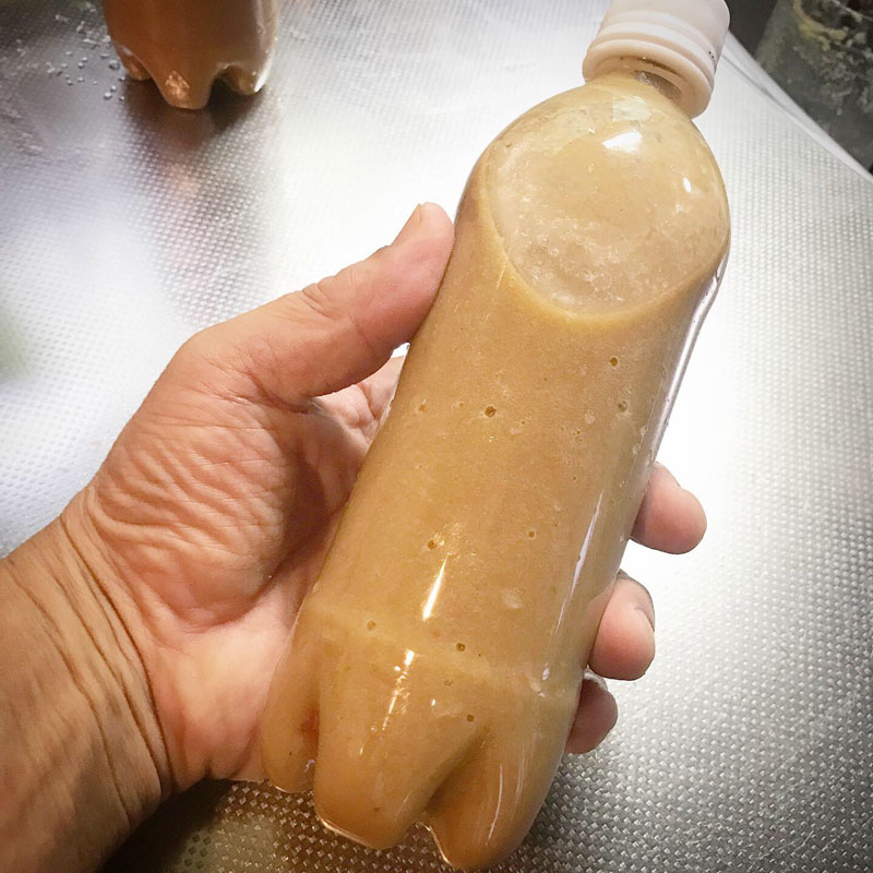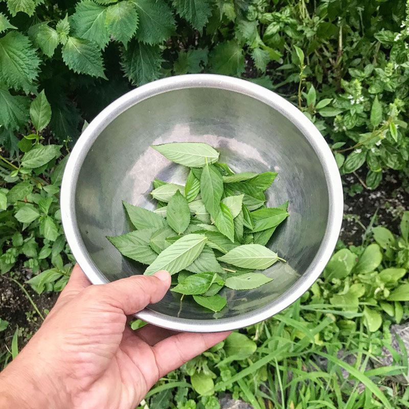 粘りが出るまで叩いたらスープ皿に入れて、そこに熱々のスープを注いで混ぜるだけ。やっと食べられた、モロヘイヤのスープ、うめー!