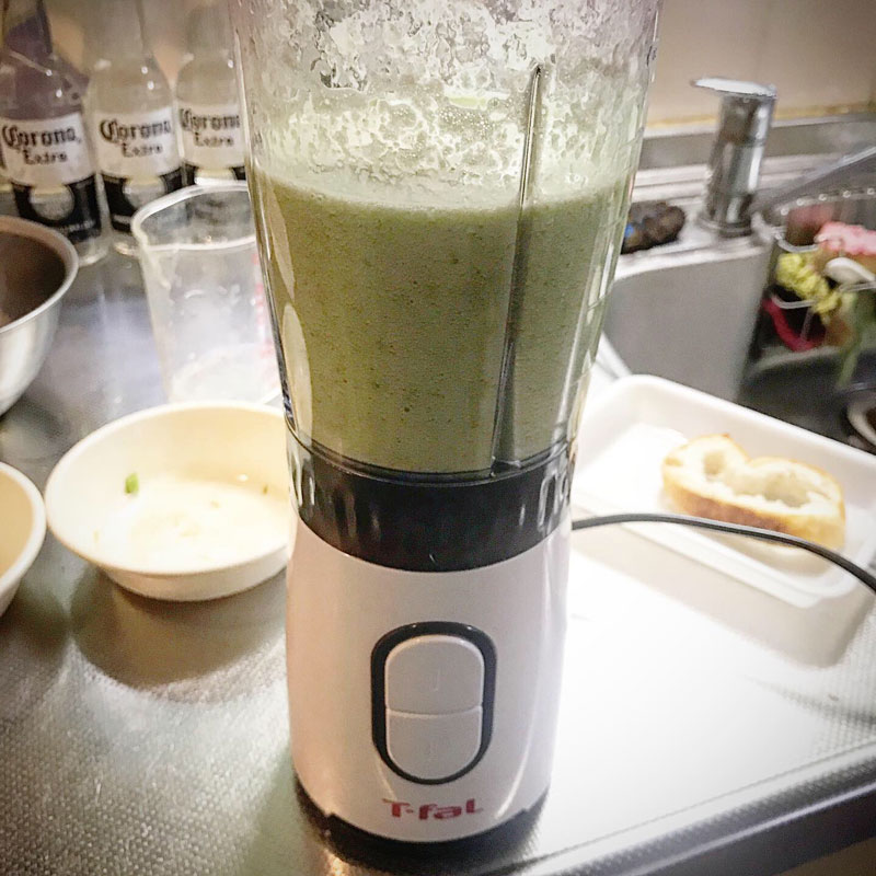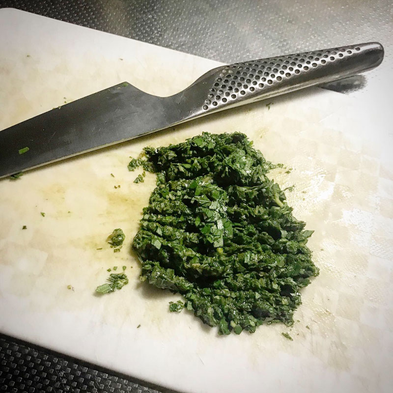 チキンスープを作ったらモロヘイヤをみじん切りにして叩く。
