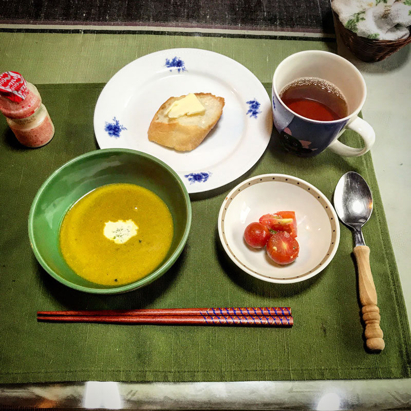 朝。親父の作ったカボチャのポタージュ。