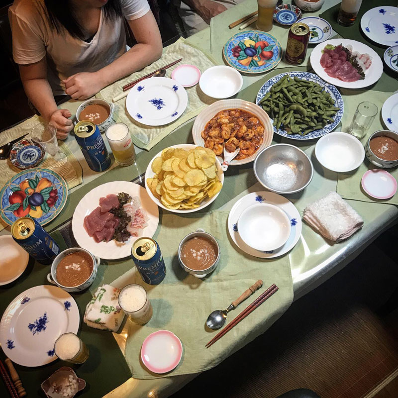エビチリ、ガスパチョ、刺し身、ポテトチップス、枝豆。