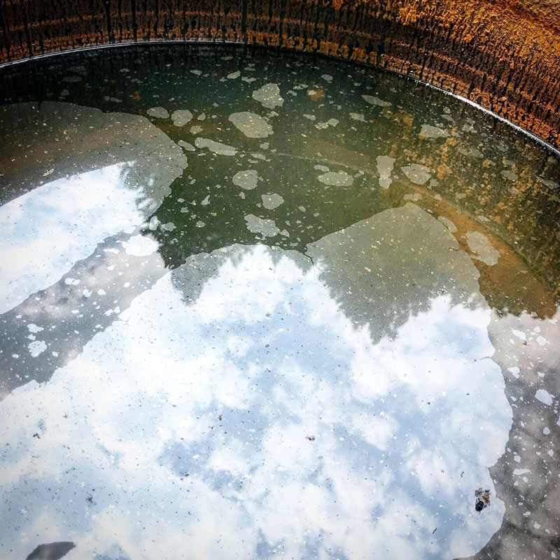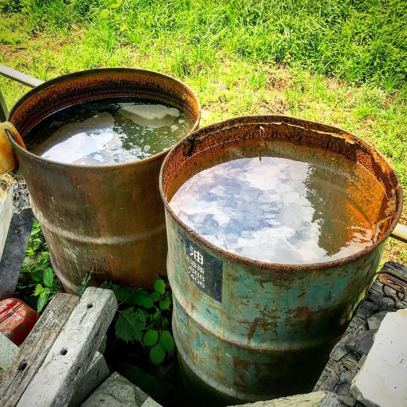 テントに降る雨を受けて貯めている。手を洗ったり石を洗ったりこれがないと困る。