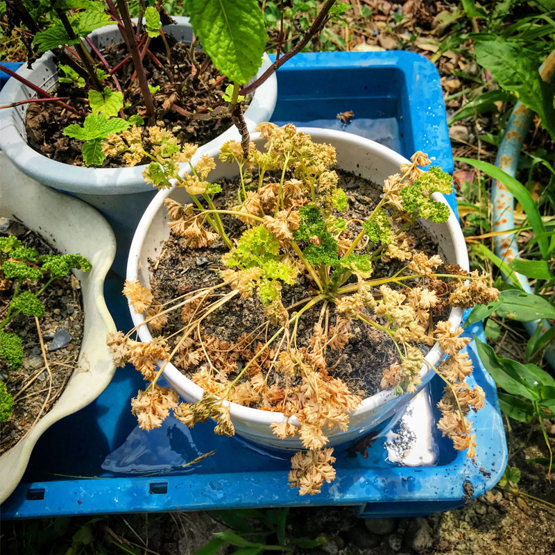 パセリの鉢、あまりの猛暑で枯らした。水につけてみる。復活するかな。畑に地植えのパセリは森のよう。