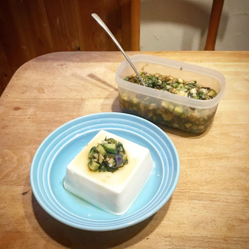 豆腐の上を丸くくり抜いて朝、仕込んでおいた山形のだしを乗せて冷奴。