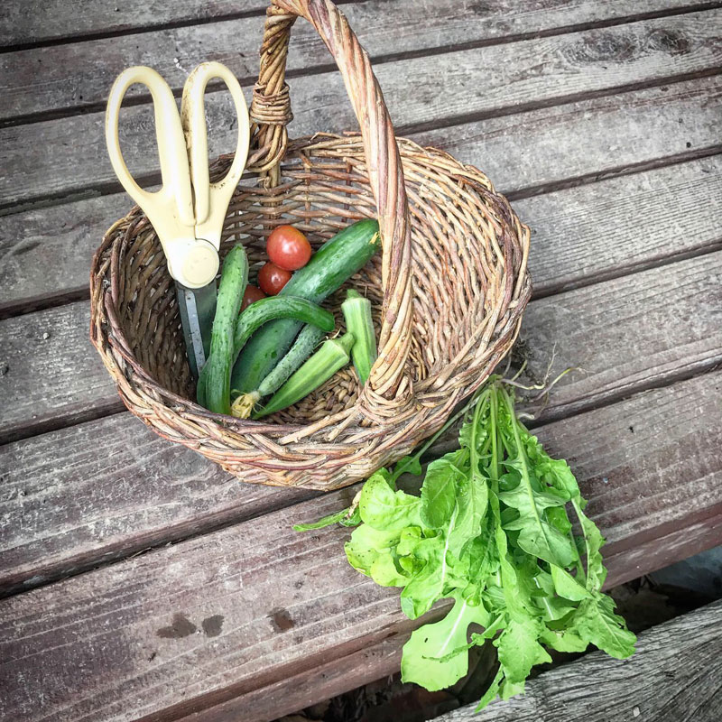 今朝の収穫。きゅうりは出来るだけ小さなうちに収穫。
