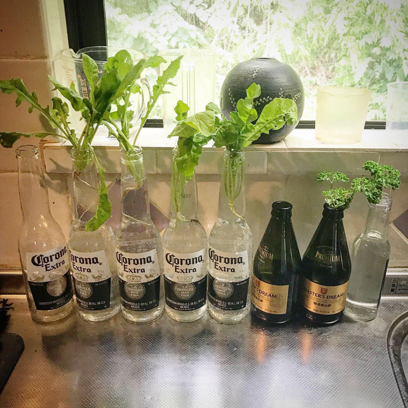 コロナビールのビンにルッコラの葉を挿している。