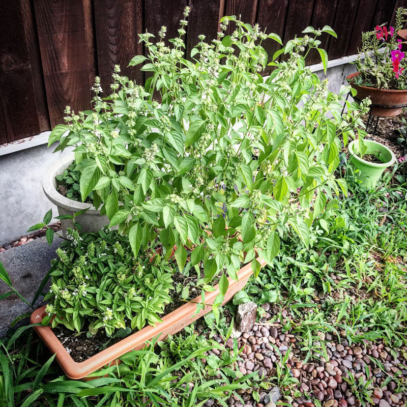 プランターのブッシュバジル?とレモンバジル。レモンバジル初めて育てたけどいい香り。