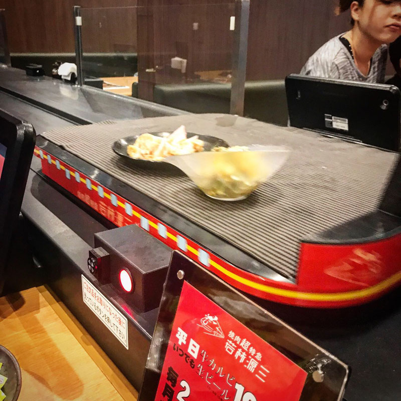雑用係兼カメラマンを焼肉と生ビールで慰労してくれてるw 回転寿司の焼肉版の様なお店。