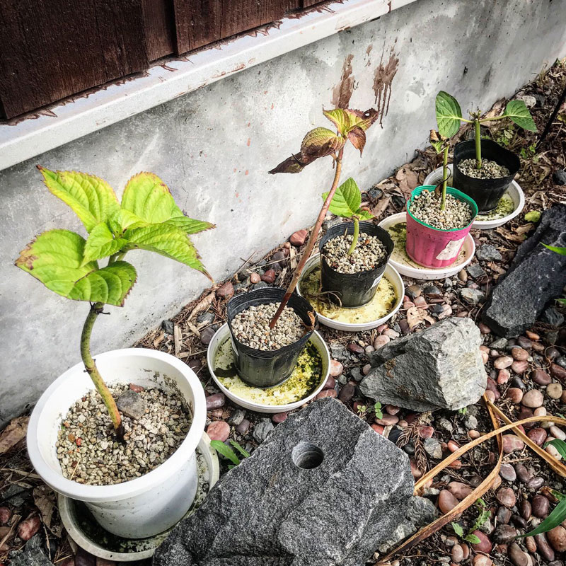 挿し木しようと軽石の中で根出し中の紫陽花。いくつかは枯れてしまいそう。