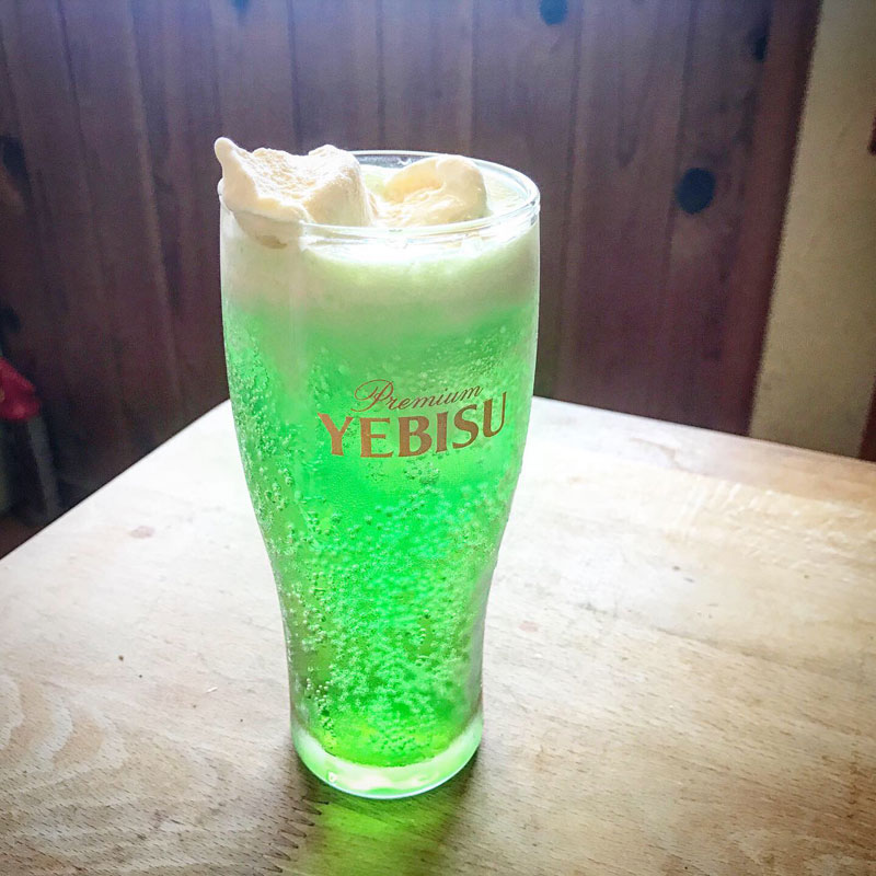 クリームソーダ。かき氷のメロンシロップと炭酸水で。バニラアイスを乗せて。