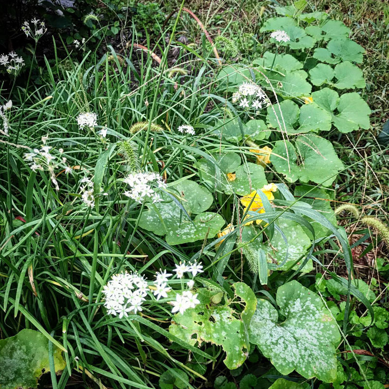 蔓をどんどん伸ばすのに実をつけてくれないこぼれ種のカボチャとニラの花。